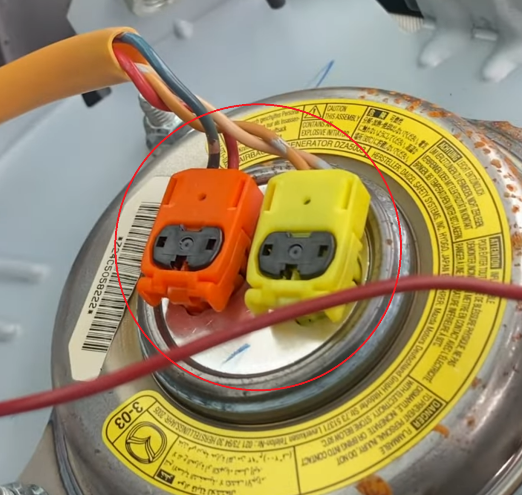 With these bolts removed the airbag is now free and should be handled with care and importance to the fact you are dealing with an explosive device. Carefully lift the airbag out and use a metal pick to pull the black plastic taps on the bag of the yellow SRS connector(s). Again, as mentioned way above in this article. You may have two yellow SRS connectors or just one. Anyhow, carefully store those black connector clips somewhere real safe. Then pull the yellow SRS connector(s) out from the airbag.